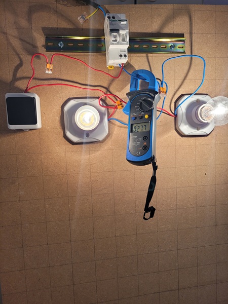 - Multimeter en amont of disjoncteur always shows 230V. En aval shows 0 if off, 230 if on