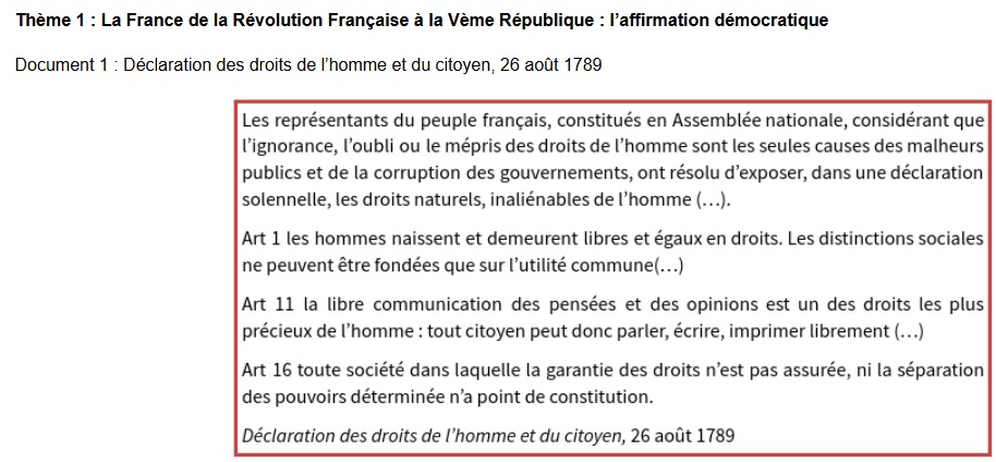 Par ailleurs, ce texte ne concerne que les hommes. On peut mentionner qu’une femme Olympe de Gouges va rédiger la Déclaration des droits de l’homme et de la citoyenne pour mettre les femmes sur un même pied d’égalité, ce qui n’était pas le cas à la Révolution. Le droit de vote des femmes ne sera obtenu qu’en 1944. - Conclusion :Cette Déclaration des droits de l’homme et du citoyen de 1789 est un texte fondateur et s’inscrit dans le 1er thème car il permet une véritable affirmation démocratique car il met en place les droits, valeurs et libertés qui caractérisent la France. On peut citer d’autres textes qui s’inspirent de cette déclaration : la déclaration universelle des droits de l’homme rédigée en 1948 au lendemain de la seconde guerre mondiale et la déclaration des droits de l’enfant. C’est donc un texte fondateur.