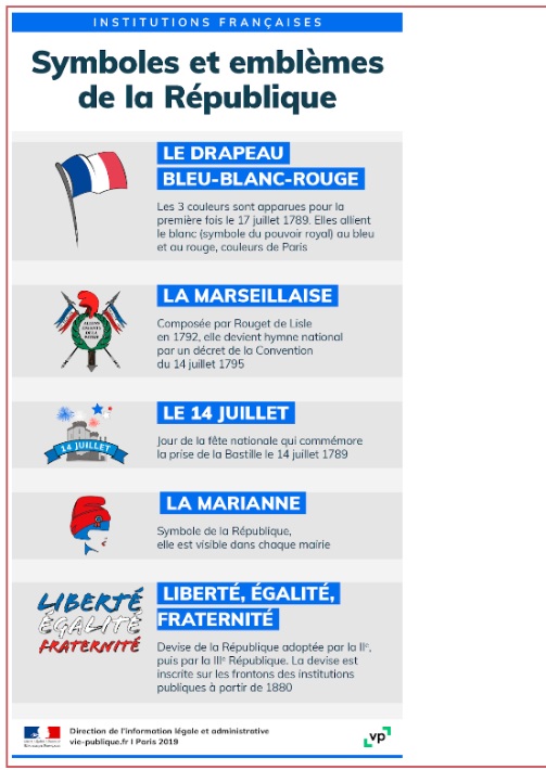 Ce document est une affiche créée par l’Etat français, la Direction de l’information légale et administrative, en 2019 qui présente les symboles et les emblèmes de la République. - Problématique
