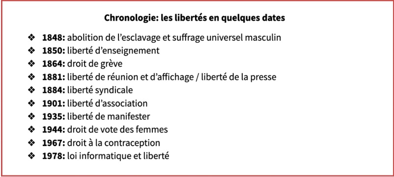 - Pendant la Révolution française et en particulier en 1789, la déclaration des droits de l’Homme et du citoyen définit et garantit les libertés fondamentales.