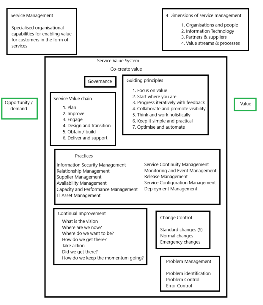For service management to function properly, it needs to work as a system. The ITIL SVS describes the inputs to this system (opportunity and demand), the elements of this system (organizational governance, service management, continual improvement and the organization’s capabilities and resources) and the outputs (achievement of organizational objectives and value for the organization, its customers and other stakeholders).